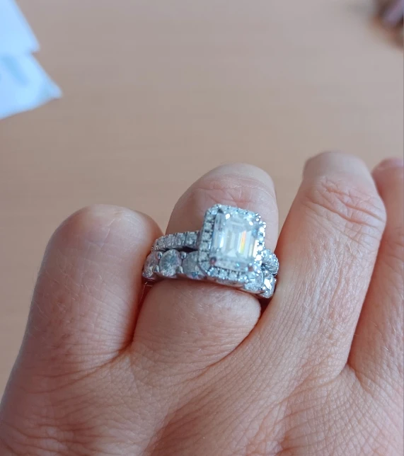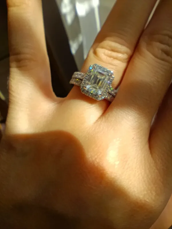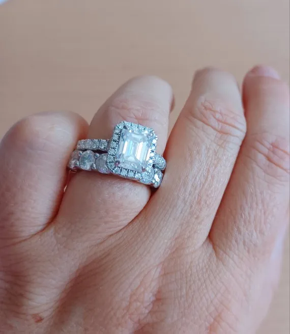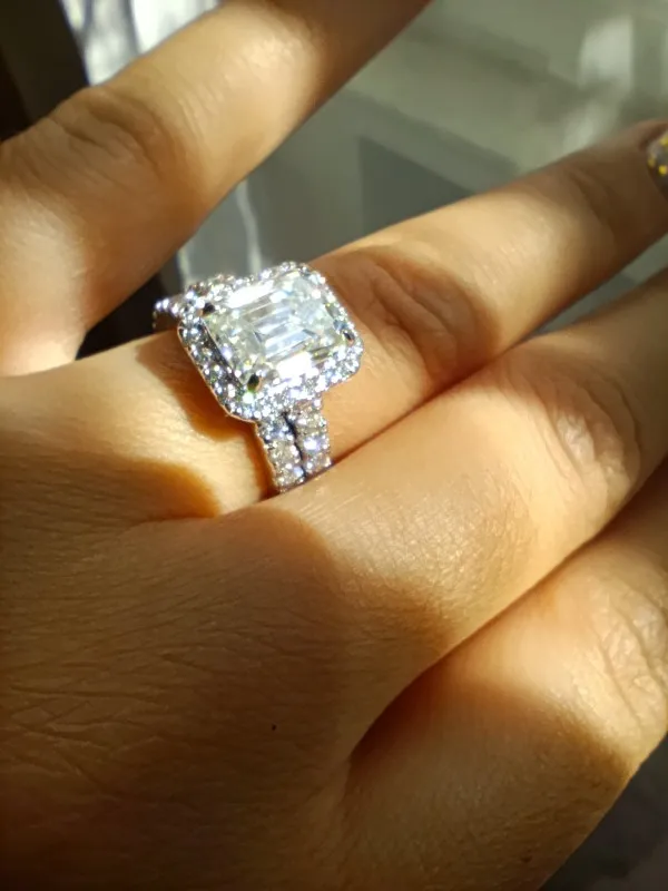 This stunning bridal ring set features a magnificent 3ct emerald cut D-color moissanite center stone surrounded by a sparkling halo of accent stones, paired with a perfectly matched vintage-inspired wedding band. Crafted in 925 sterling silver, this complete bridal set combines Art Deco sophistication with maximum brilliance for an unforgettable look.