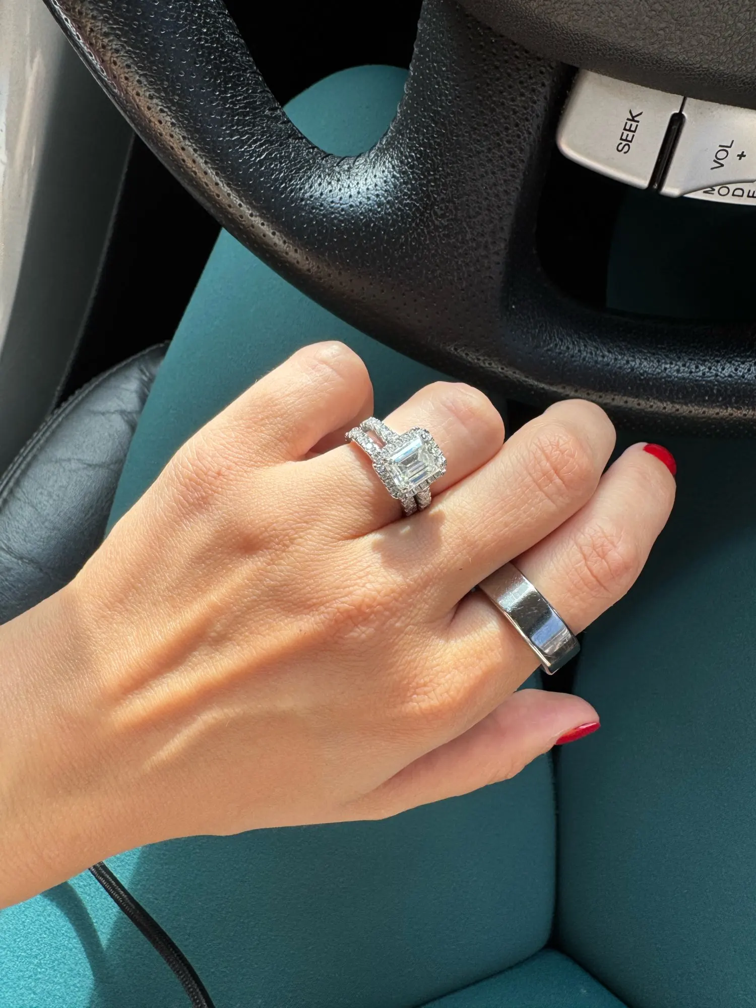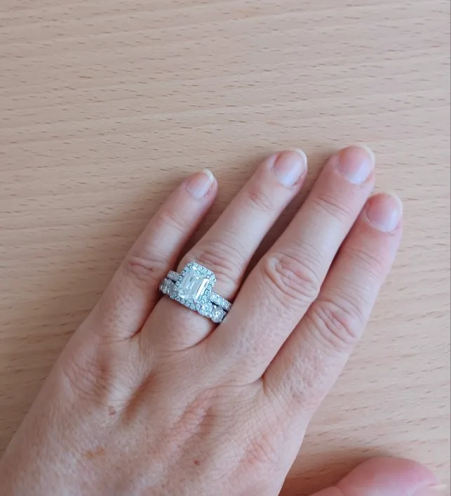 This emerald cut halo bridal set is perfect for those who love vintage glamour with sophisticated, clean lines. The emerald cut's unique step-cut faceting creates a mesmerizing hall-of-mirrors effect that showcases the exceptional clarity of D-color moissanite, while the sparkling halo adds extra dimension and makes the center stone appear even larger. This cut has been beloved since the Art Deco era for its elegant, elongating silhouette and understated glamour. The matching wedding band features vintage-inspired detailing that complements the engagement ring beautifully, creating a cohesive, polished look. Each set comes beautifully packaged with a gift box, certificate, and polish cloth, making this an excellent choice for proposals, engagements, or as a complete bridal solution that combines timeless sophistication with ethical sourcing and exceptional value.