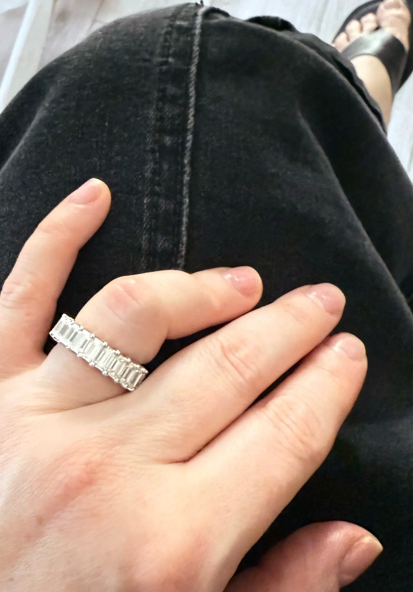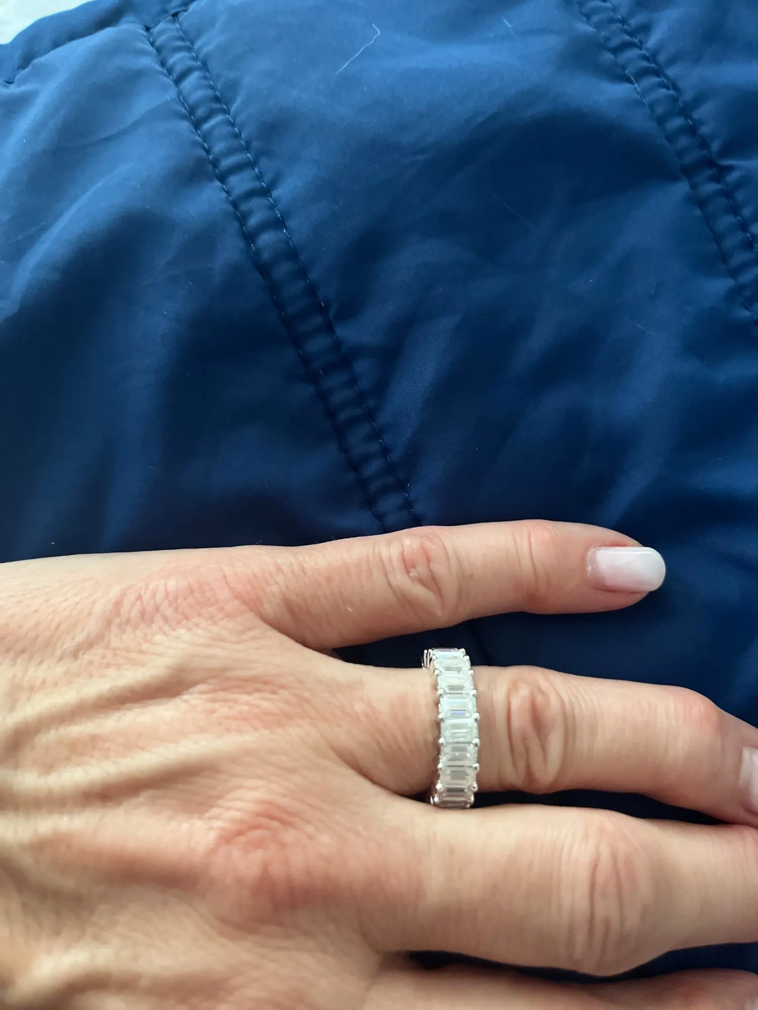 Each 3x5mm emerald cut moissanite is carefully selected for its D-color grade and exceptional clarity. The eternity setting ensures continuous sparkle from every angle, while the sterling silver band provides comfortable all-day wear with a luxurious finish.