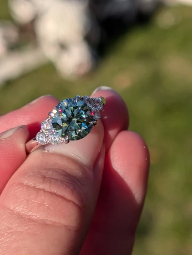 Mohamed Emmerich Just stunning. Photos do not do this ring justice. They really do pick the prettiest and best cut stones. The green color changes in various lighting sometimes pale green sometimes dark green. The brilliance is remarkable. Don't think just buy. The ring runs true to size. I made an error in previous post/purchase and ordered a size 7 which was too small (i got fat lol). I am now a size 8 in ring finger. So i had to return and reorder because i just couldnt live without this ring!