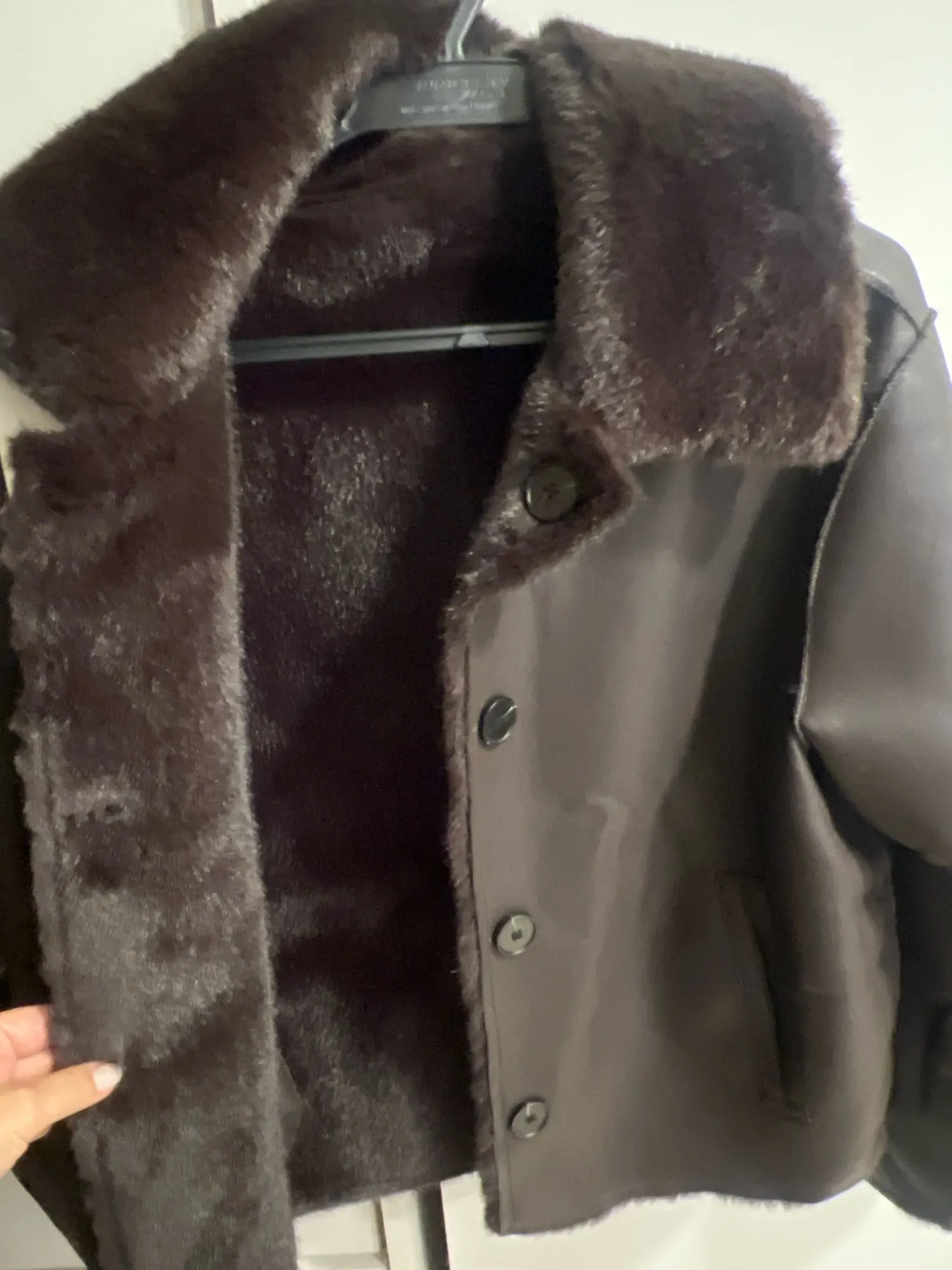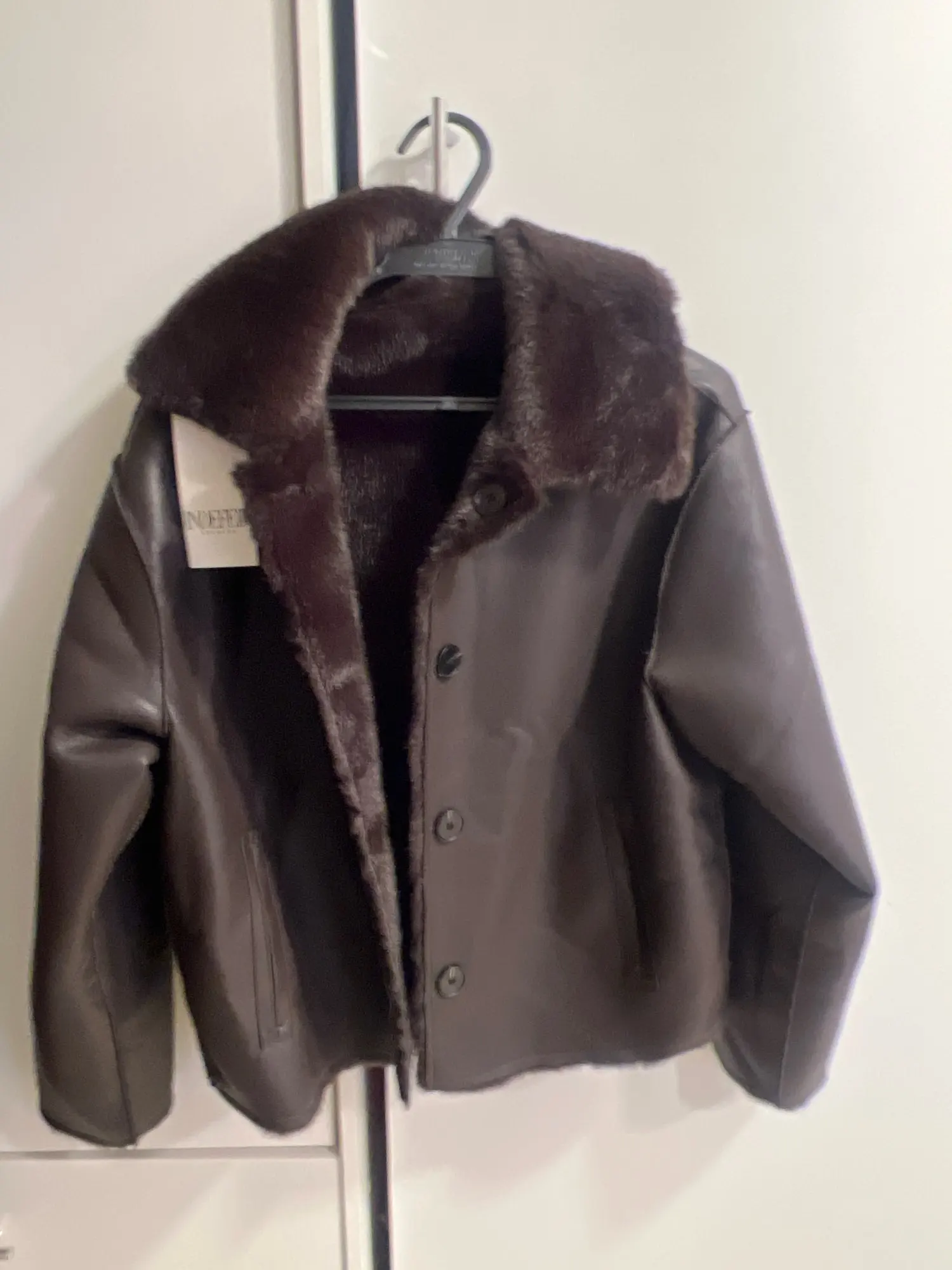 To maintain the quality and appearance of your reversible faux leather jacket, wipe clean with a damp cloth and mild soap. Avoid machine washing. Hang to dry away from direct heat or sunlight. Store on a padded hanger to maintain shape and prevent creasing on both sides.
