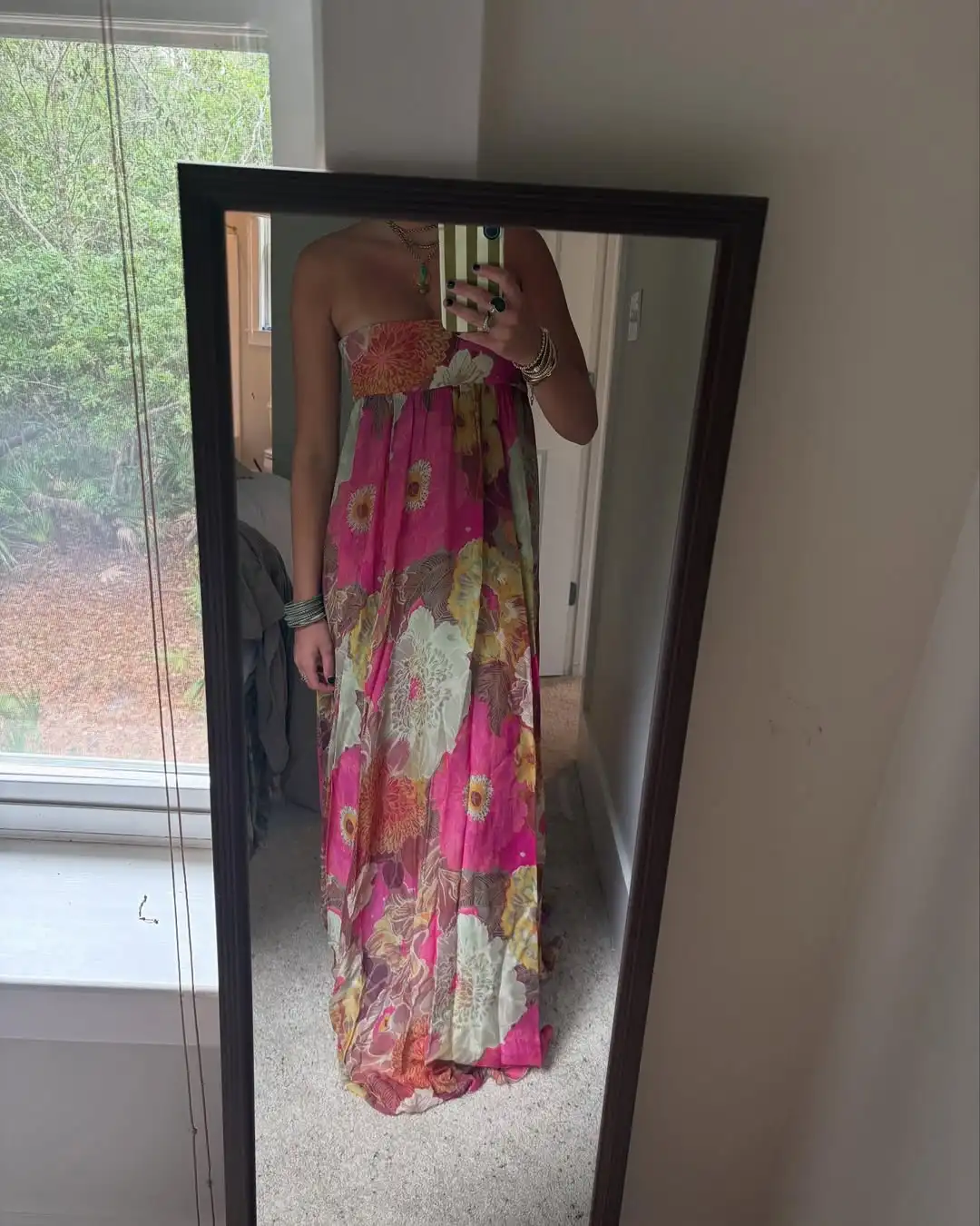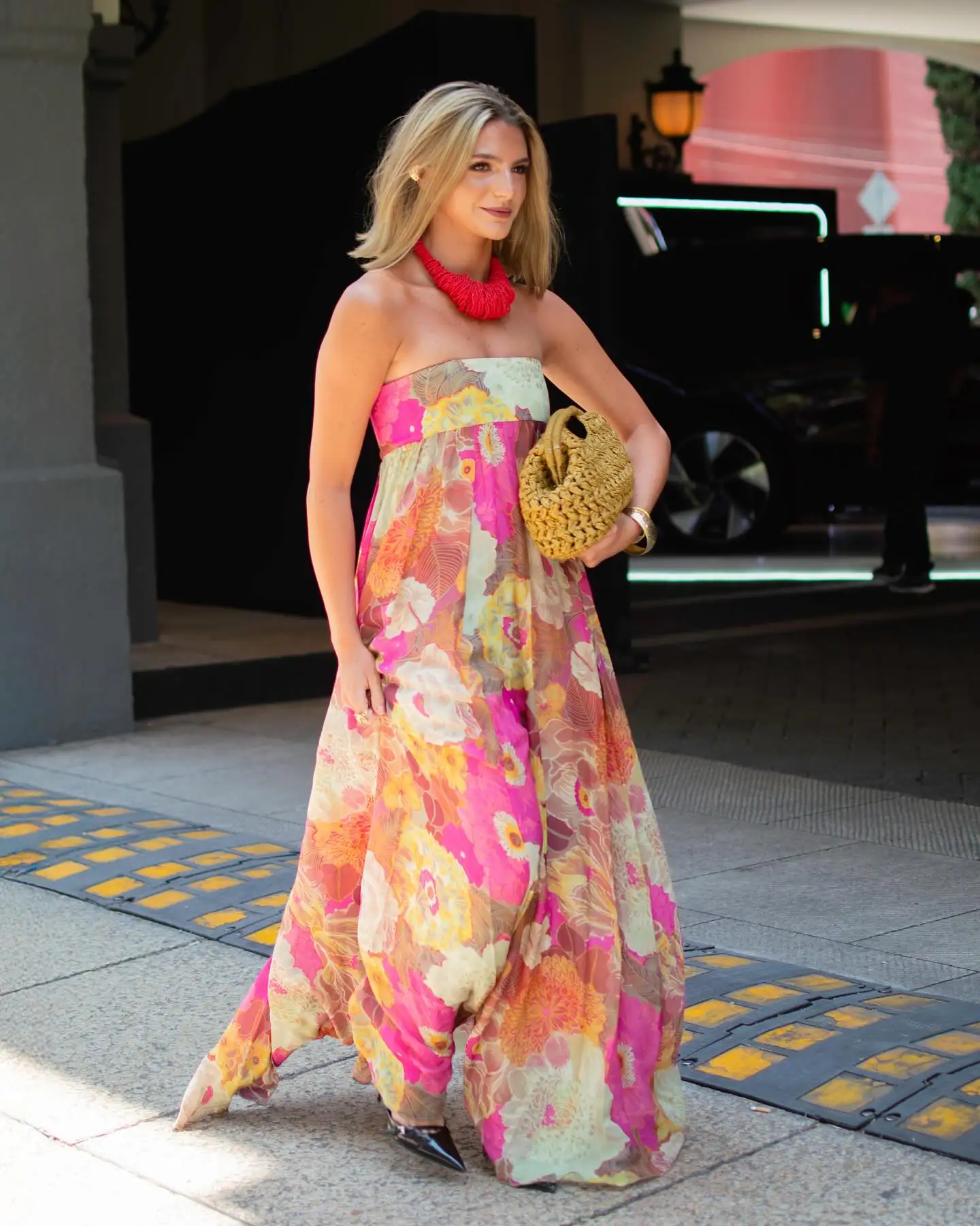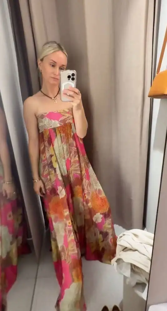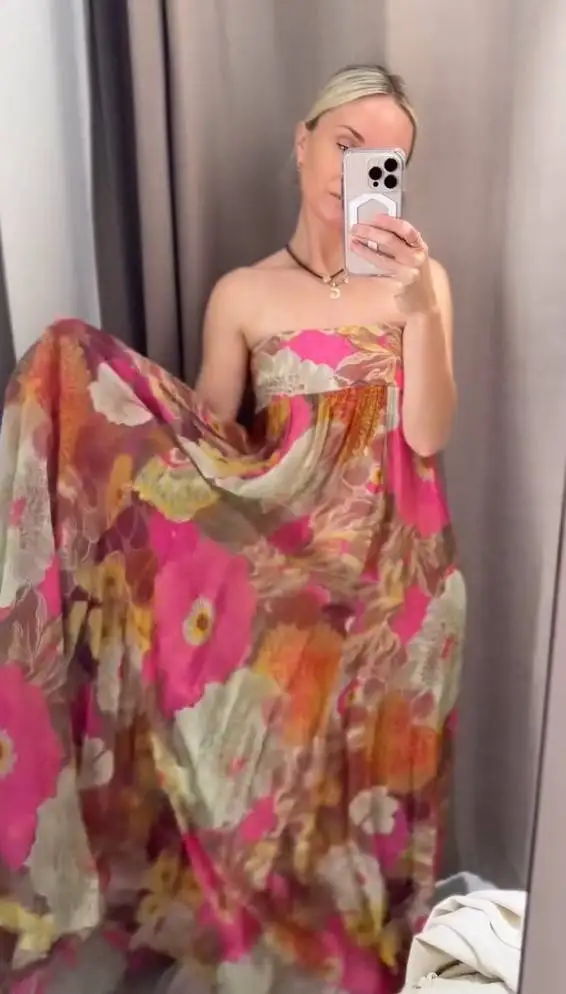 Pair with strappy heels and statement earrings for wedding-guest elegance, or add delicate jewelry for cocktail party sophistication. The strapless design and backless detail make a statement on their own—keep accessories balanced and let the vibrant floral print and pleated texture shine. Add a clutch and classic makeup for timeless elegance.
